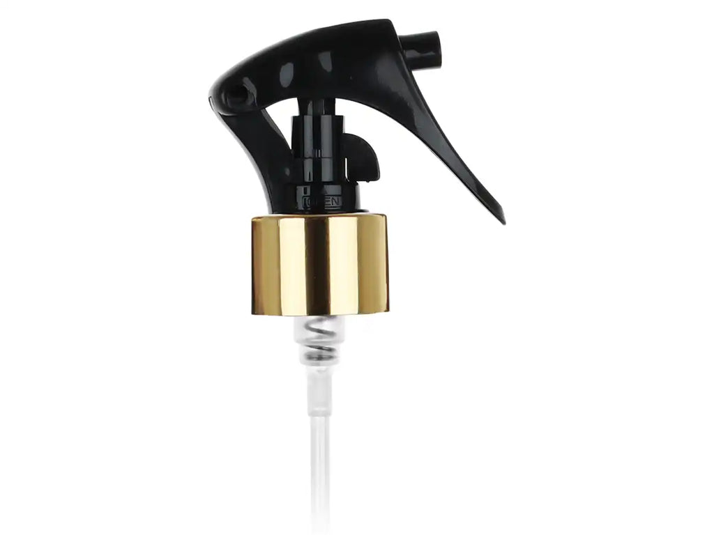 This 24-410 Gold/Black Fine Mist Mini Trigger Style Sprayer offers precise, fine mist dispensing for small-scale applications. Featuring a 7.75" dip tube and delivering 0.21ml per spray, it ensures controlled and efficient product use. Its compact design provides ease of handling, making it ideal for cosmetics, cleaning solutions, or other liquid products needing a gentle, even mist. Durable gold and black components add a touch of style and reliability to your packaging solution.