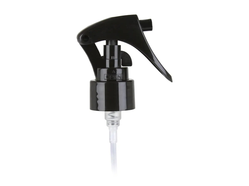 This 24-410 black fine mist mini trigger style sprayer features a 7.75" dip tube and dispenses 0.21ml per spray. Its compact design offers easy, controlled application of liquids in a fine mist, making it perfect for personal care, cleaning, or fragrance products. The trigger mechanism provides comfortable handling for consistent output, supporting efficient and precise spraying every time.