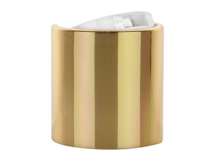 Gold metal shell with white disc-top cap designed for 24/410 neck finish bottles. Features a .307" orifice opening, ideal for controlled dispensing of lotions, serums, and liquid products. Durable metal construction ensures reliable performance and a premium appearance.